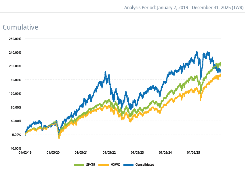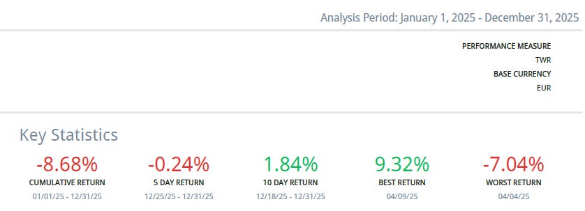 My portfolio closed 2025 with a return of -8.7%. At least since I’ve been keeping detailed records, it was the year with the largest divergence between my portfolio’s performance and the benchmark indices. It’s an uncomfortable gap, and I won’t pretend otherwise. Not so much because of the opportunity cost—had I simply indexed, the outcome would have been better and far less mentally taxing—but because watching family wealth decline is, in itself, psychologically difficult.